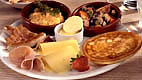 ... Pancake, Käsescheiben1,2, gekochter Schinken, Rührei, Rostbratwürstchen7, gebratener Bacon4 und gegrillte Tomaten, Champignons, 6 halbe Scheiben Toast, frischer Orangensaft