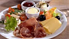 ... Tomaten-Mozzarella mit Pesto, Obstsalat, Oliven mit Parmesan, Marmelade, italienischer Landschinken, Coppa und Salami, dazu Ciabatta