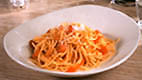 ... Tagliatelle mit Tomatensugo, Frühlingslauch und gebratenen Scampi. Auf Wunsch mit Parmesan