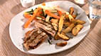 ... mit luftgetrocknetem Landschinken1, sonnengetrockneten Tomaten2 und Kräutern gefüllter Schweinerücken mit Marktgemüse, holypotatoes und Sourcream